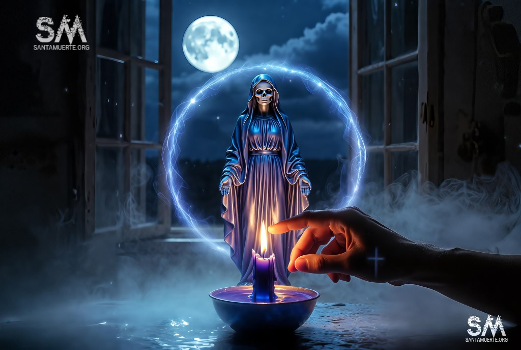 “Toma la vela azul y conságrala en el nombre de la Santa Muerte. Mientras enciendes la llama, visualiza un círculo de luz azul que te rodea, protegiéndote. Recita con fervor: