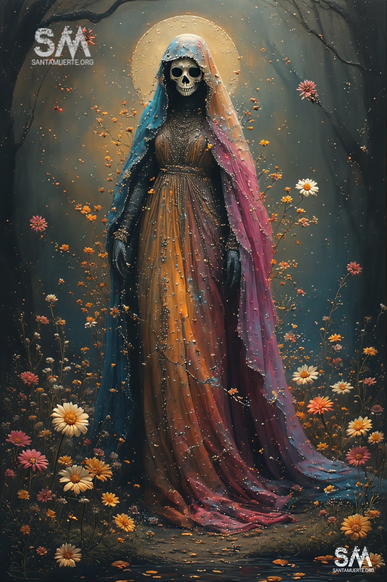 Oh, venerada Santa Muerte, tu que caminas en el filo del día y la noche, te pido que extiendas sobre mí tus alas de paz y protección. Rodea este lugar con tu manto sagrado y purifica mi corazón, llenándolo de fe y coraje. Que tu escudo sea firme y tu guía certera, conduciéndome por caminos seguros y apartando de mí todo mal. Amén.